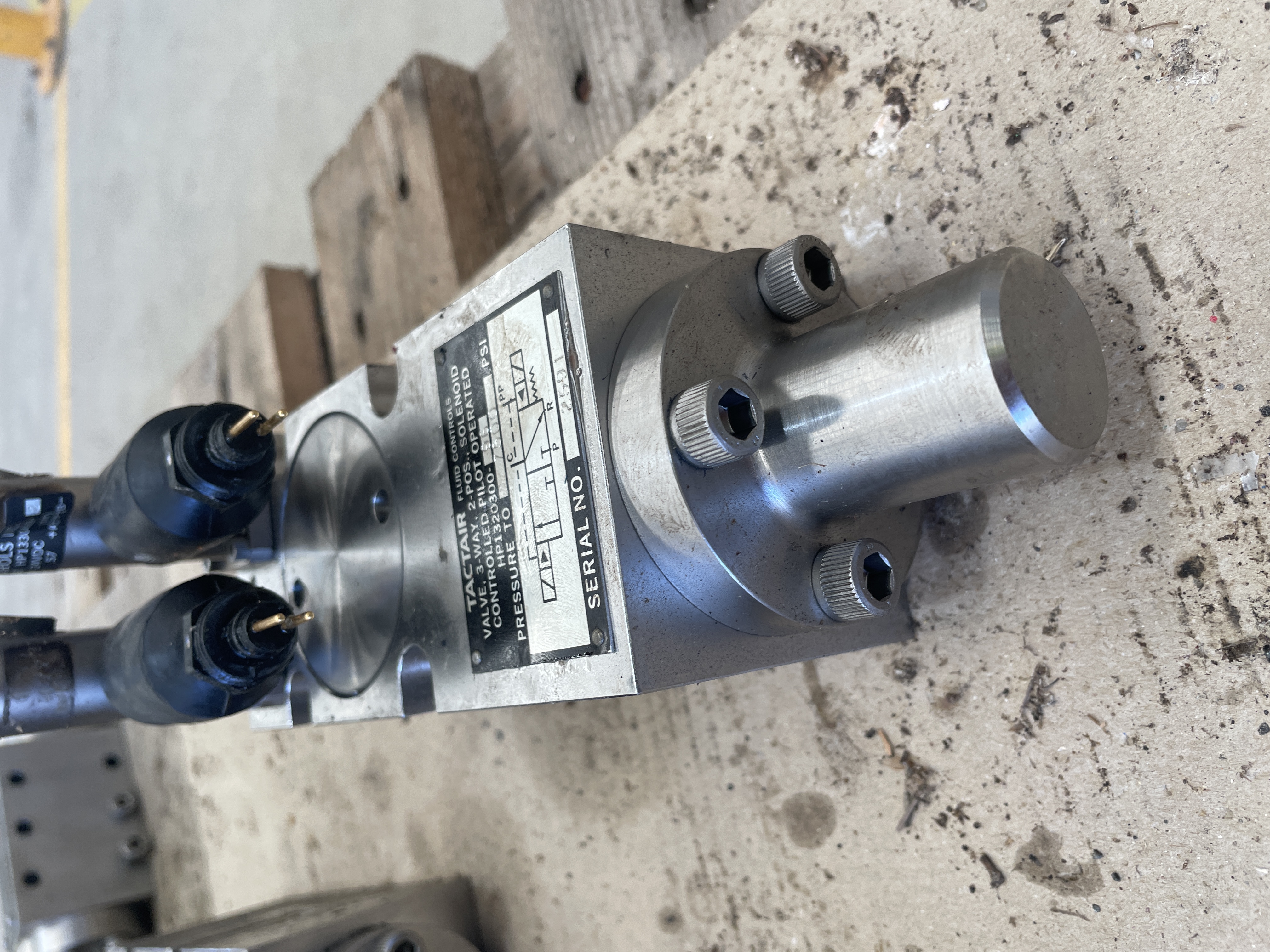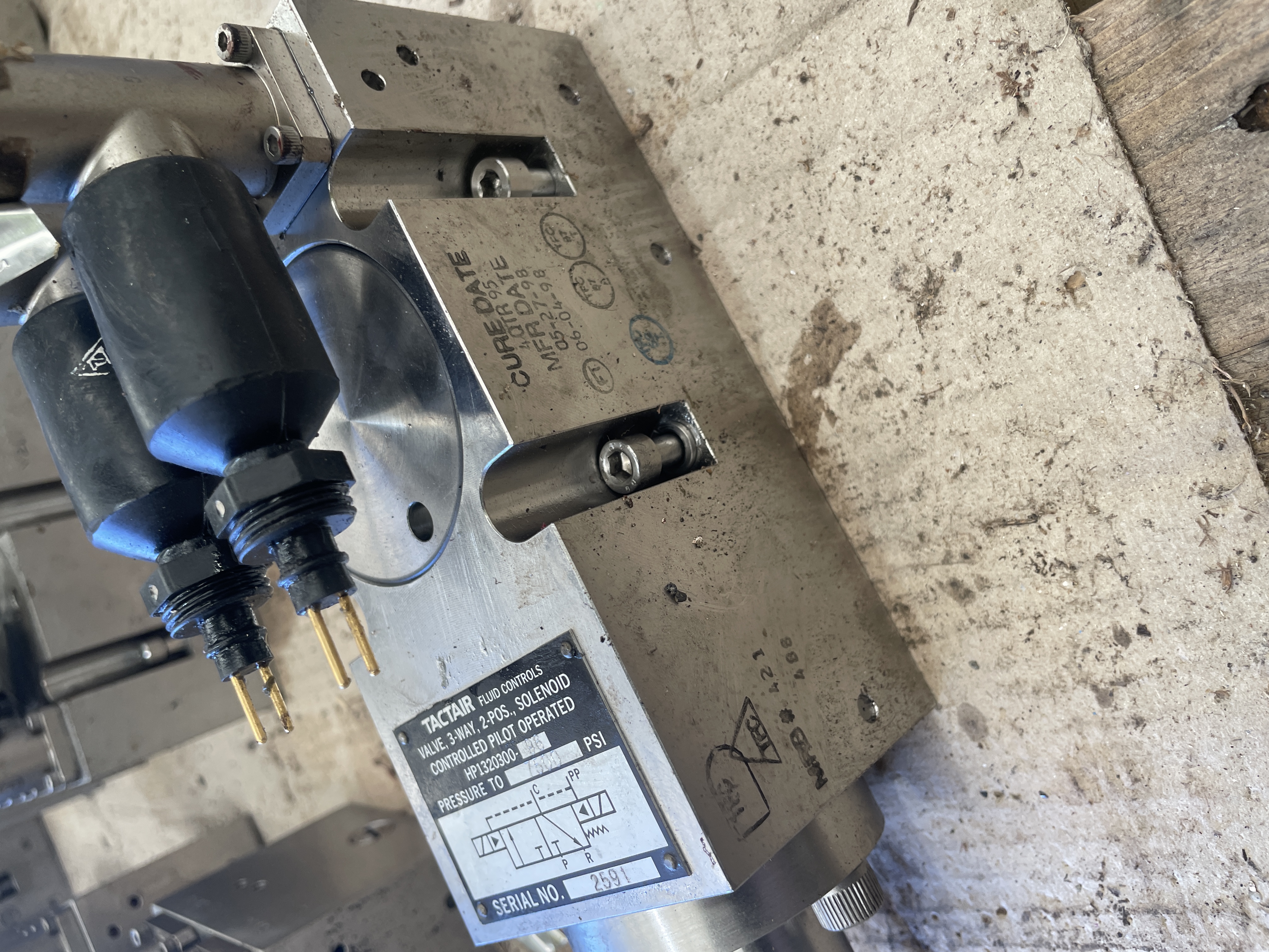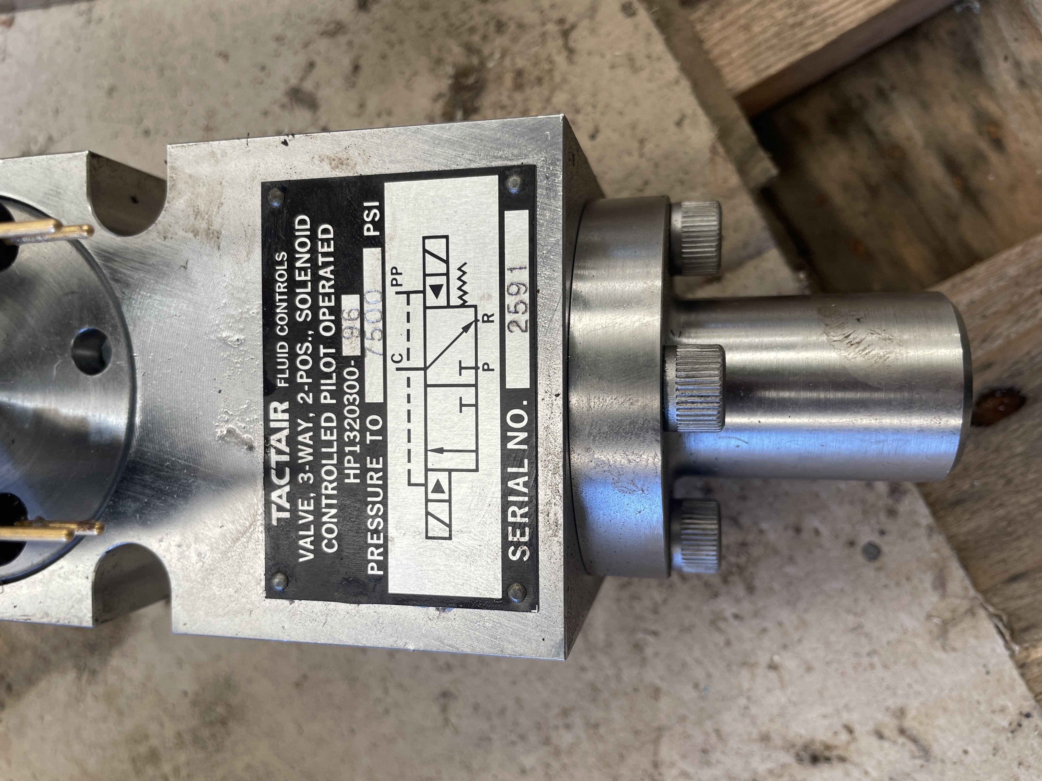 Nine used Tactair Fluid Controls Inc valves, originally removed from subsea control modules (SCMs). Units were operational prior to removal and have been stored indoors since recovery. Functional condition is expected to be intact, though testing is recommended to confirm performance.